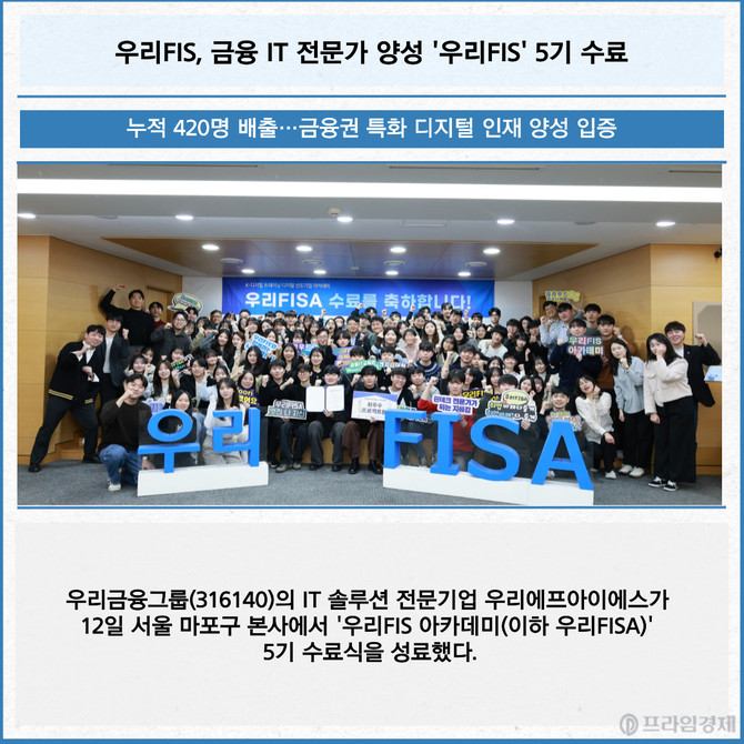 [프라임경제] 우리금융그룹(316140)의 IT 솔루션 전문기업 우리에프아이에스가 12일 서울 마포구 본사에서 '우리FIS 아카데미(이하 우리FISA)' 5기 수료식을 성료했다.