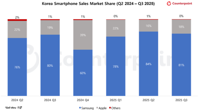 12일 글로벌 시장조사업체 카운터포인트리서치에 따르면 올 3분기 삼성의 국내 스마트폰 점유율은 81%다.
