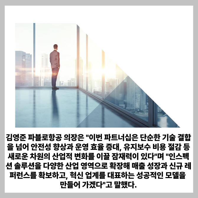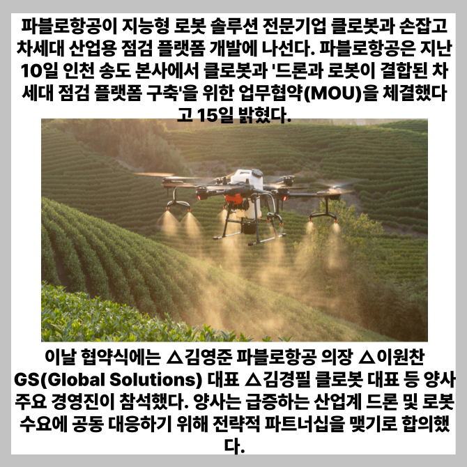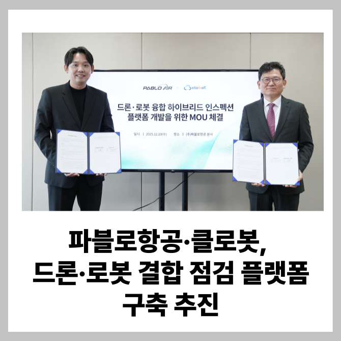 [프라임경제] 파블로항공이 지능형 로봇 솔루션 전문기업 클로봇과 손잡고 차세대 산업용 점검 플랫폼 개발에 나선다고 15일 밝혔다.