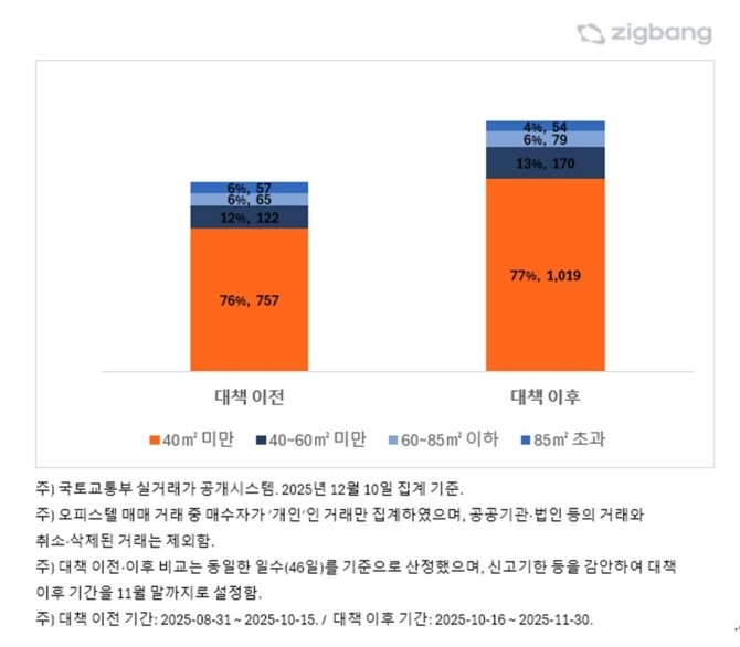 오피스텔이 아파트 대체 주거지로 주목받으며 중대형 확대 가능성이 거론되고 있지만, 실제 시장에서는 40㎡ 미만과 40~60㎡ 미만 비중이 가장 높게 유지됐다. 반면 85㎡ 초과 대형은 뚜렷한 증가세 없이 기존 수준을 이어갔다.