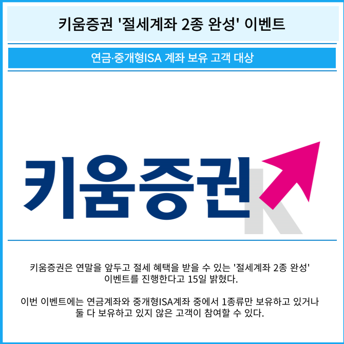 [프라임경제] 키움증권(039490)은 연말을 앞두고 절세 혜택을 받을 수 있는 '절세계좌 2종 완성' 이벤트를 진행한다고 15일 밝혔다.