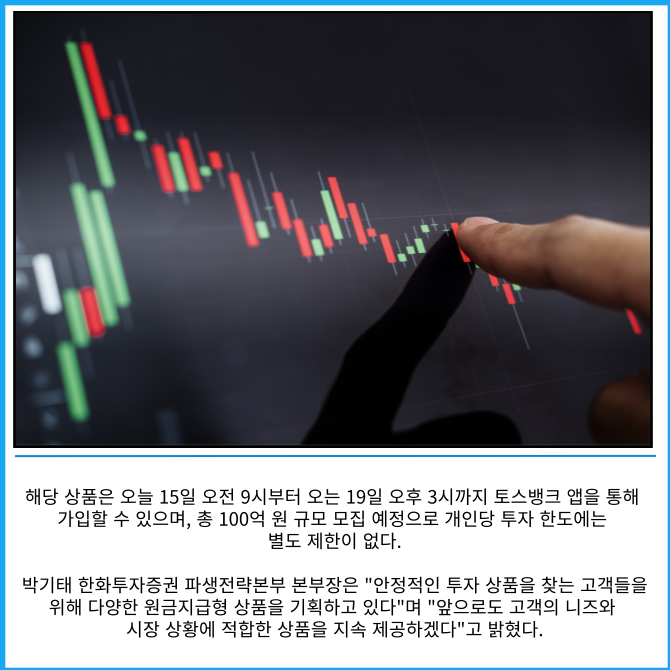 [프라임경제] 한화투자증권(003530)은 원금 안정 기반의 수익 기회를 원하는 투자자를 위해 토스뱅크에서 가입 가능한 '한화스마트ON 주가연계파생결합사채(ELB) 79호'를 출시했다고 15일 밝혔다.