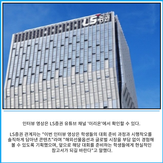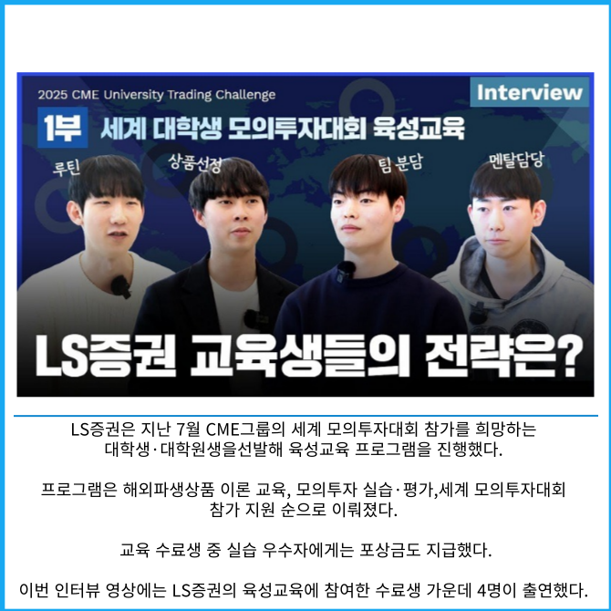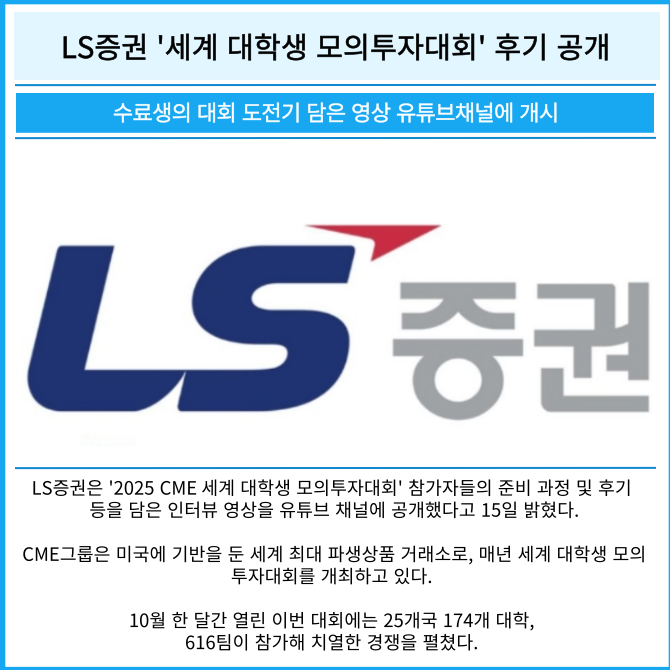 [프라임경제] LS증권(078020)은 '2025 CME 세계 대학생 모의투자대회' 참가자들의 준비 과정 및 후기 등을 담은 인터뷰 영상을 유튜브 채널에 공개했다고 15일 밝혔다.