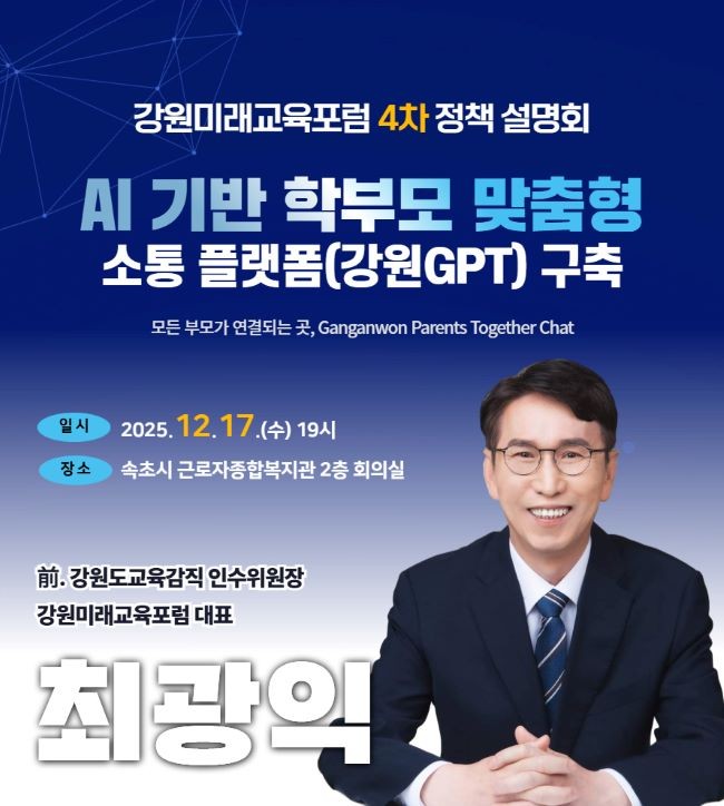 [프라임경제] 강원미래교육포럼 최광익 대표는 강원교육의 새로운 방향을 제시하기 위한 'AI 기반 학부모 맞춤형 소통 플랫폼(강원GPT) 구축 정책설명회'를 오는 17일 오후 7시, 속초 근로자종합복지관 2층에서 개최한다.