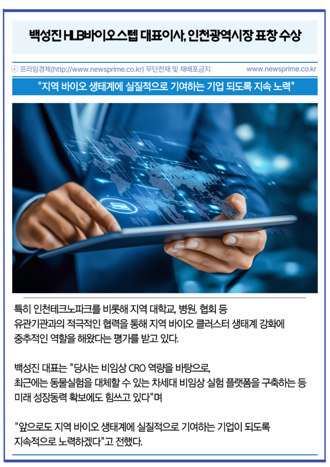 [카드] 백성진 HLB바이오스텝 대표이사, 인천광역시장 표창 수상