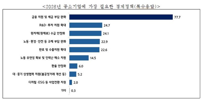 가장 필요한 경제 정책으로는 '금융 지원 및 세금 부담 완화(77.7%)'가 압도적 지지를 받았다.