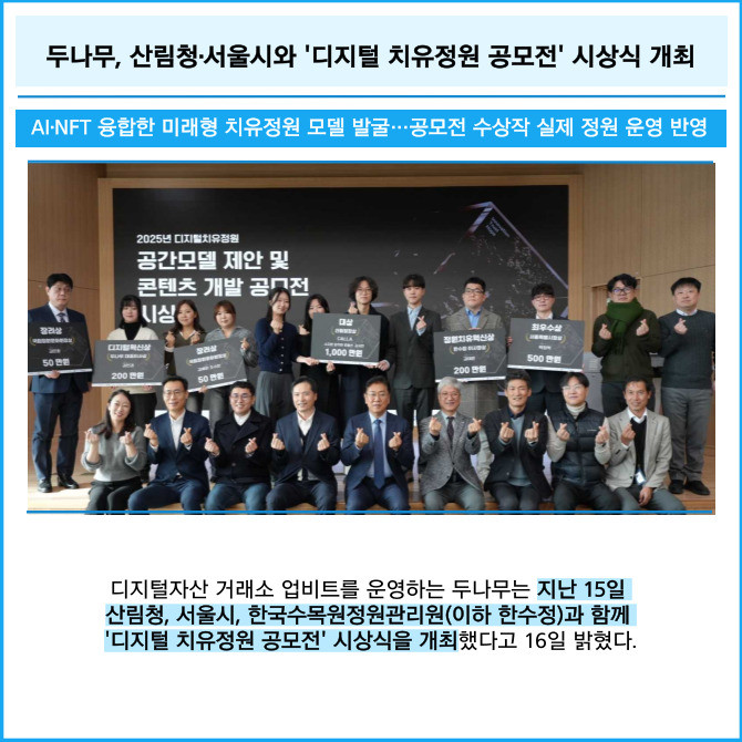 [프라임경제] 디지털자산 거래소 업비트를 운영하는 두나무는 지난 15일 산림청, 서울시, 한국수목원정원관리원(이하 한수정)과 함께 '디지털 치유정원 공모전' 시상식을 개최했다고 16일 밝혔다.