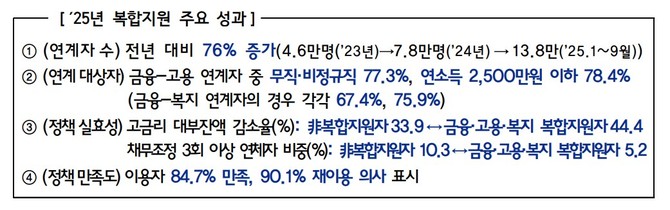 실제로 지난 2년간 서민금융통합지원센터와 고용복지플러스센터 등을 통해 복합지원을 받은 이용자는 약 21만명에 달한다. 지난 9월 말 기준 연계 인원은 13만8000명으로, 전년 대비 76% 증가했다.