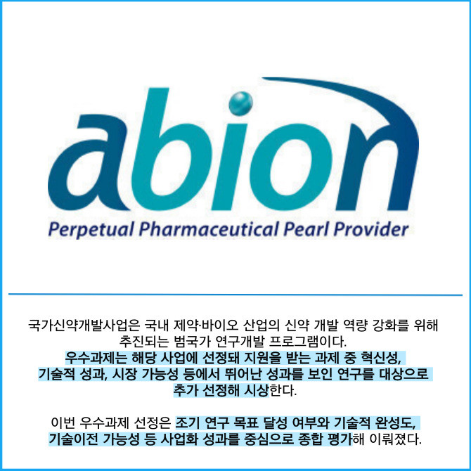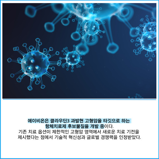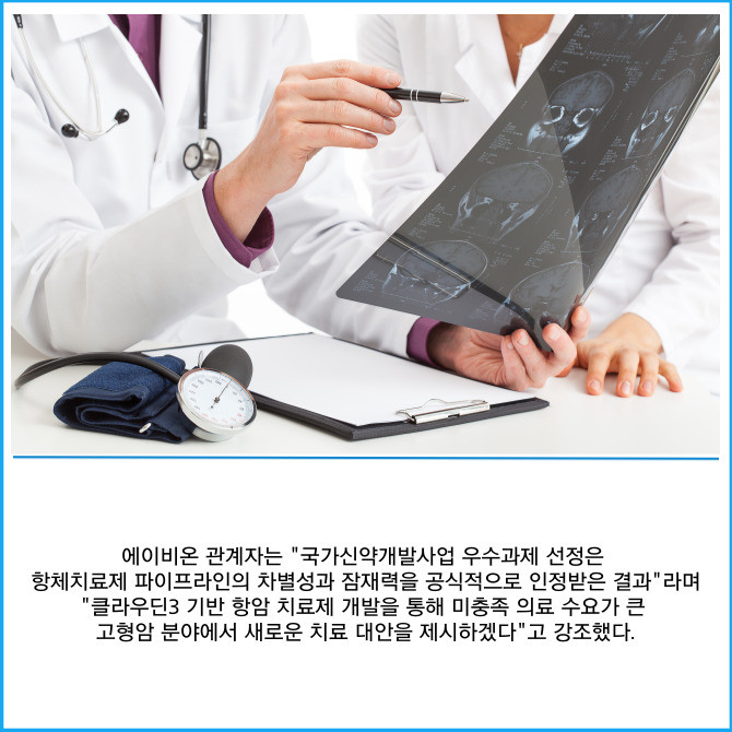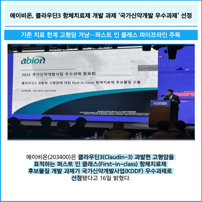 [프라임경제] 에이비온(203400)은 클라우딘3(Claudin-3) 과발현 고형암을 표적하는 퍼스트 인 클래스(First-in-class) 항체치료제 후보물질 개발 과제가 국가신약개발사업(KDDF) 우수과제로 선정됐다고 16일 밝혔다.