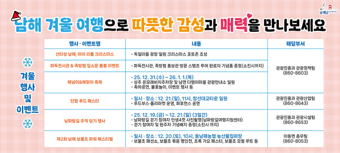 남해군은 겨울 여행 관광객 유치와 체류형 관광 활성화를 위해 다양한 매력적인 행사 이벤트를 개최한다고 17일 밝혔다.