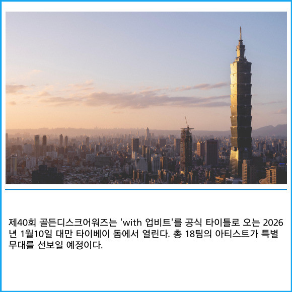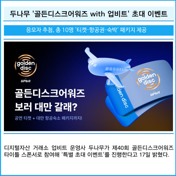 [프라임경제] 디지털자산 거래소 업비트 운영사 두나무가 제40회 골든디스크어워즈 타이틀 스폰서로 참여해 '특별 초대 이벤트'를 진행한다고 17일 밝혔다.