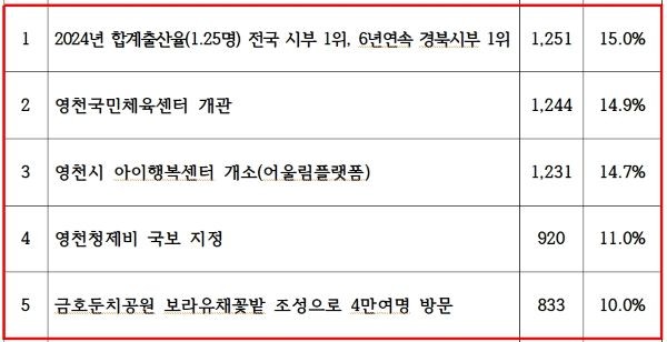 집계 결과 총 투표 수는 8358표로, △2024년 합계출산율(1.25명) 전국 시부 1위, 6년 연속 경북 시부 1위(15.0%) △영천국민체육센터 개관(14.9%) △영천시 아이행복센터 개소(어울림플랫폼)(14.7%) △영천청제비 국보 지정(11.0%) △금호둔치공원 보라유채꽃밭 조성으로 4만여명 방문(10.0%) 순으로 선정됐다.