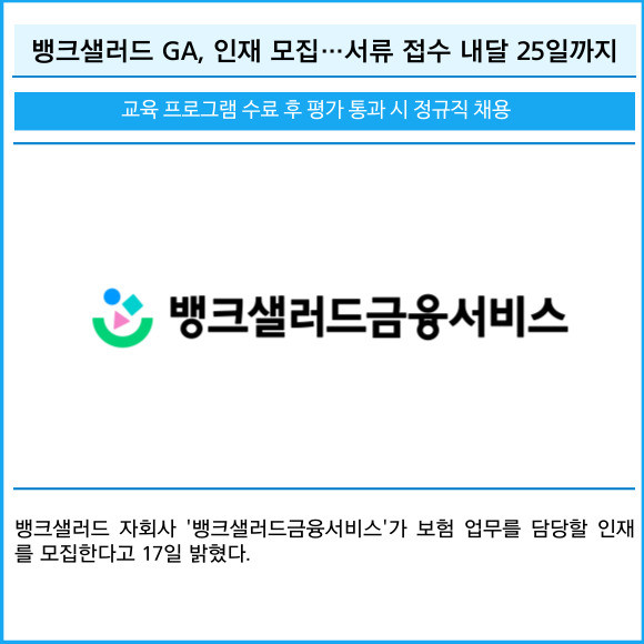 [프라임경제] 뱅크샐러드 자회사 '뱅크샐러드금융서비스'가 보험 업무를 담당할 인재를 모집한다고 17일 밝혔다.