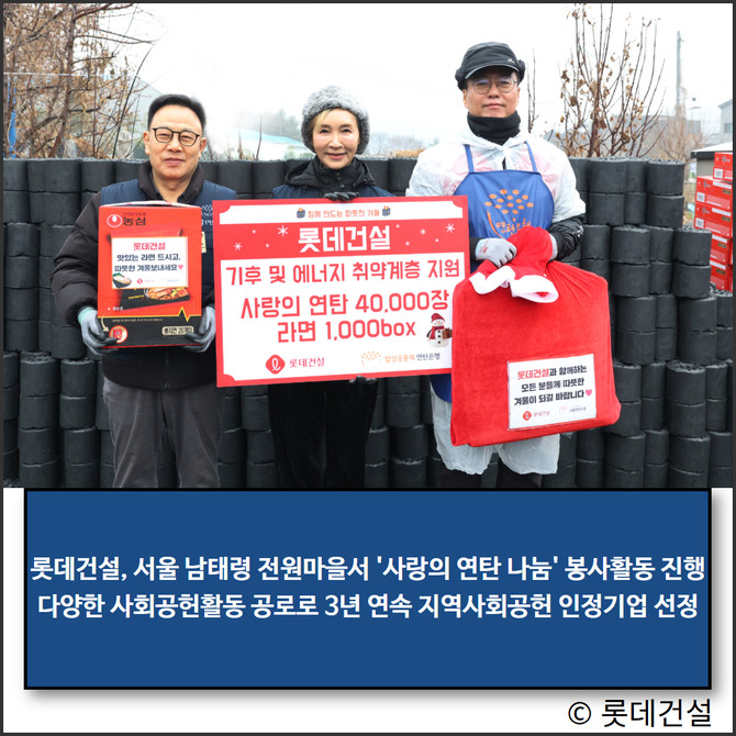 이날 오일근 대표를 비롯해 롯데건설 임직원으로 이뤄진 샤롯데 봉사단 55명과 밥상공동체 연탄은행 홍보대사로 활동하고 있는 정애리 배우가 연탄 2000장과 라면 80박스를 직접 배달했다. 밥상공동체 연탄은행은 연탄 나눔과 무료 급식봉사 등의 복지사업을 진행하고 있는 사회복지법인이다.