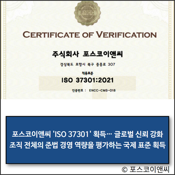 포스코이앤씨가 윤리준법경영인증원으로부터 국제 공인 규범준수경영시스템(ISO 37301) 인증을 획득했다.