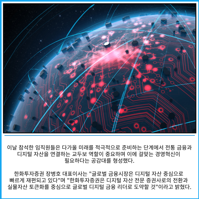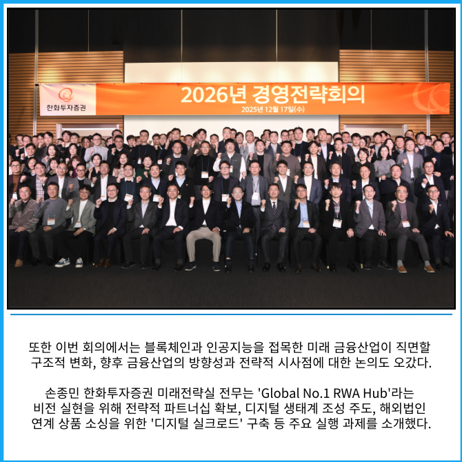[프라임경제] 한화투자증권(003530)은 2026년 경영전략회의에서 '디지털 자산 전문 증권사로 전환'이라는 중장기 목표와 'Global No.1 RWA(실물기반 토큰화 자산) Hub' 비전을 공식 선포했다고 밝혔다.