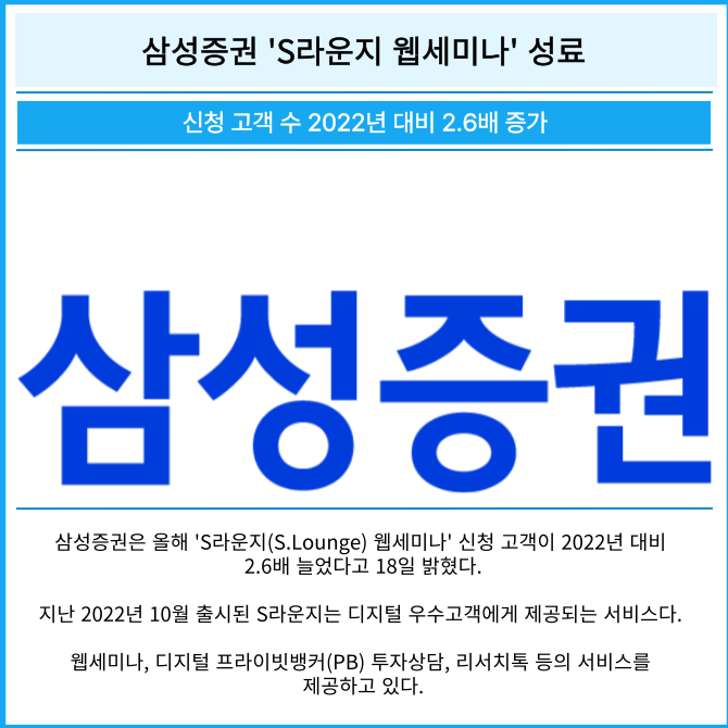 [프라임경제] 삼성증권(016360)은 올해 'S라운지(S.Lounge) 웹세미나' 신청 고객이 2022년 대비 2.6배 늘었다고 18일 밝혔다.