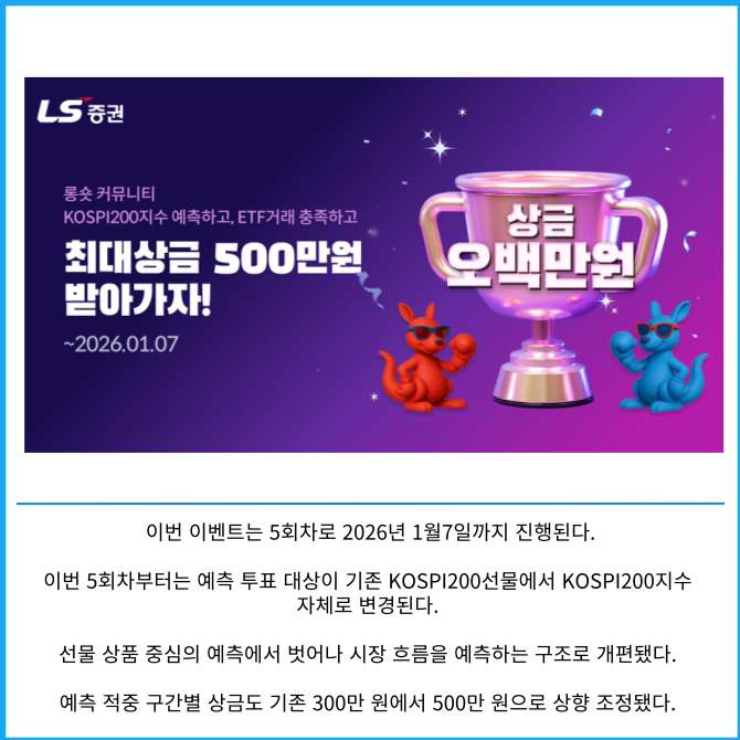 [프라임경제] LS증권(078020)은 롱숏커뮤니티 이용 고객들을 대상으로 진행하는 이벤트 운영방식을 변경하고 상금 및 참여 대상을 확대했다고 18일 밝혔다.