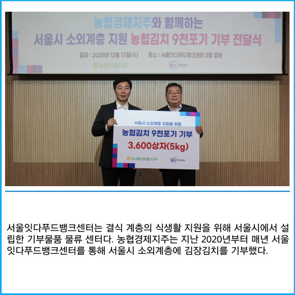 [프라임경제] 농협경제지주는 지난 17일 서울잇다푸드뱅크센터에서 '겨울나기 김장김치 기부행사'를 실시했다고 18일 밝혔다.