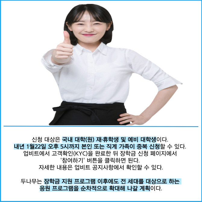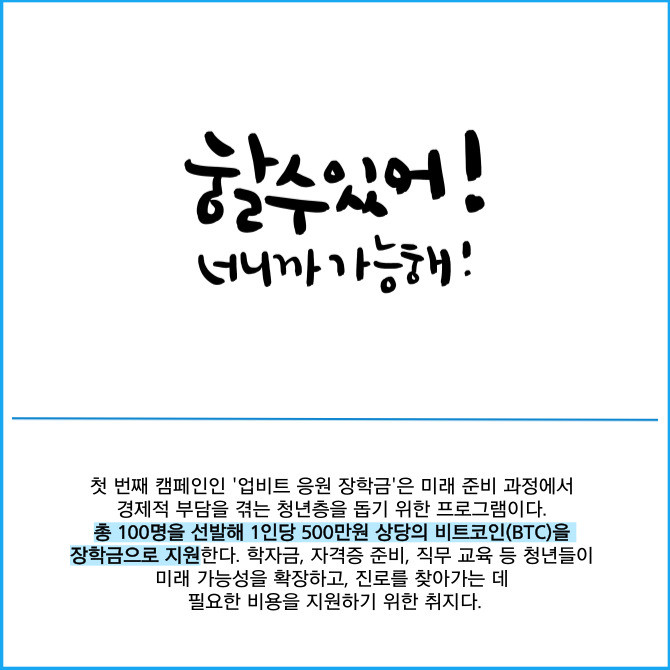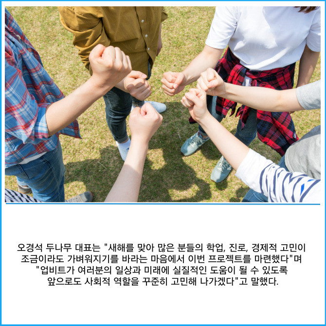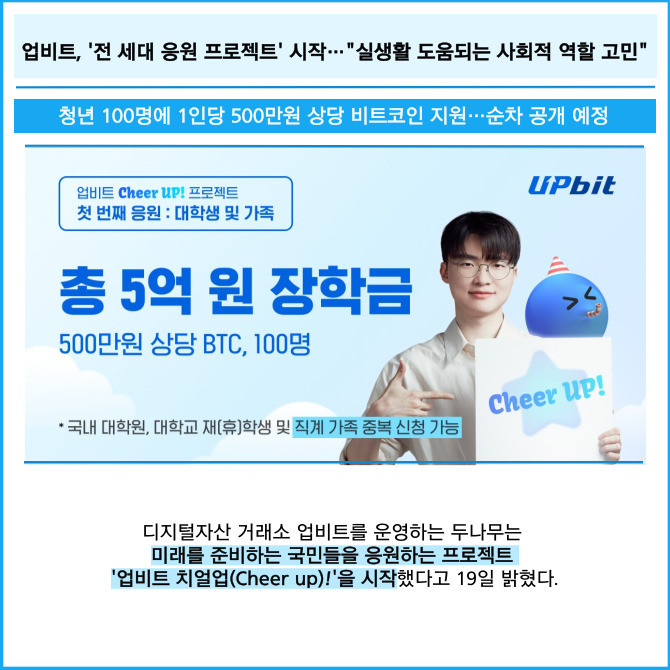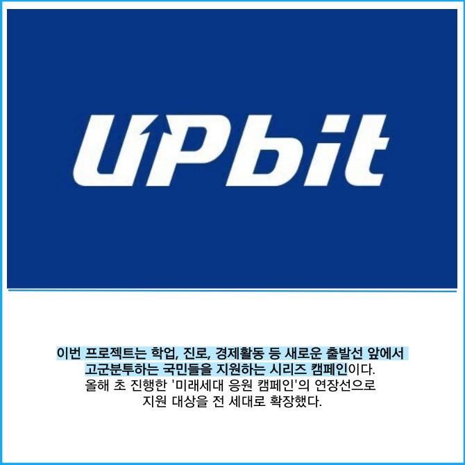 [프라임경제] 디지털자산 거래소 업비트를 운영하는 두나무는 미래를 준비하는 국민들을 응원하는 프로젝트 '업비트 치얼업(Cheer up)!'을 시작했다고 19일 밝혔다.