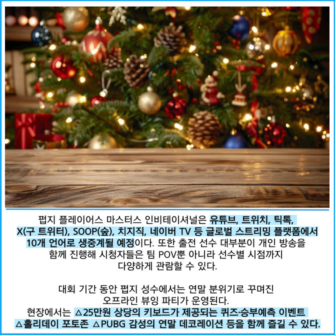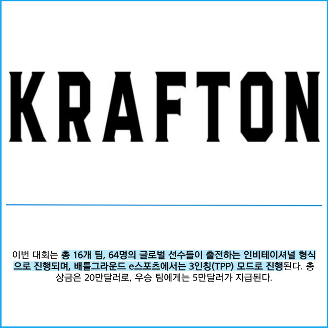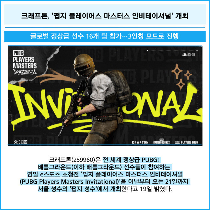 [프라임경제] 크래프톤(259960)은 전 세계 정상급 PUBG: 배틀그라운드(이하 배틀그라운드) 선수들이 참여하는 연말 e스포츠 초청전 '펍지 플레이어스 마스터스 인비테이셔널(PUBG Players Masters Invitational)'을 이날부터 오는 21일까지 서울 성수의 '펍지 성수'에서 개최한다고 19일 밝혔다.