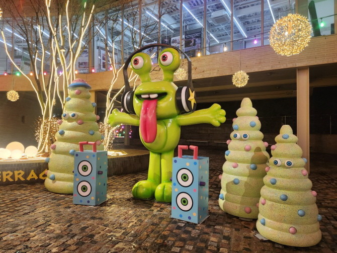 중정으로 이동하면 분위기는 또 달라진다. 눈꽃 조명 아래 헤드셋을 쓴 몬스터 '피지'의 대형 조형물을 중심으로, 다이내믹한 파티를 형상화한 공간이 펼쳐진다. 여기에 퍼플과 핑크 컬러로 변신한 트리와 몬스터 '버보' '포포'의 조형물과 오브제 등을 감상할 수 있다.