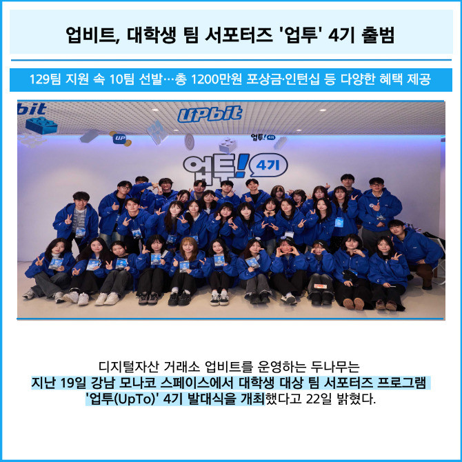 [프라임경제] 디지털자산 거래소 업비트를 운영하는 두나무는 지난 19일 강남 모나코 스페이스에서 대학생 대상 팀 서포터즈 프로그램 '업투(UpTo)' 4기 발대식을 개최했다고 22일 밝혔다.