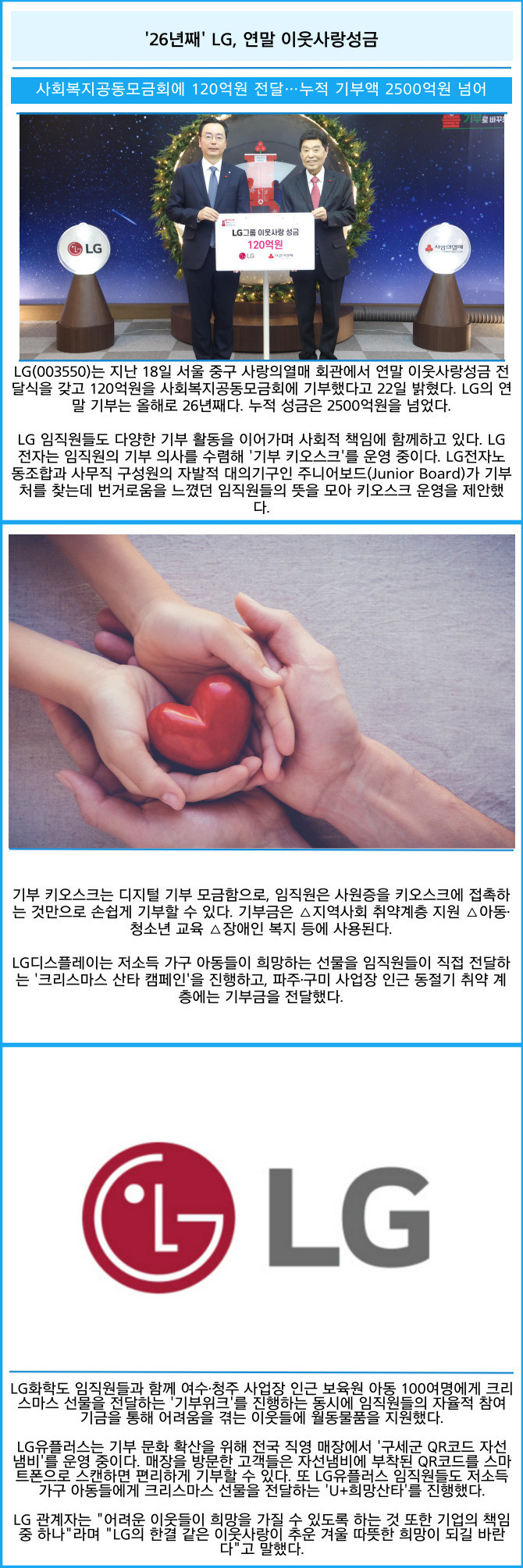 [프라임경제] LG(003550)는 지난 18일 서울 중구 사랑의열매 회관에서 연말 이웃사랑성금 전달식을 갖고 120억원을 사회복지공동모금회에 기부했다고 22일 밝혔다. LG의 연말 기부는 올해로 26년째다. 누적 성금은 2500억원을 넘었다.