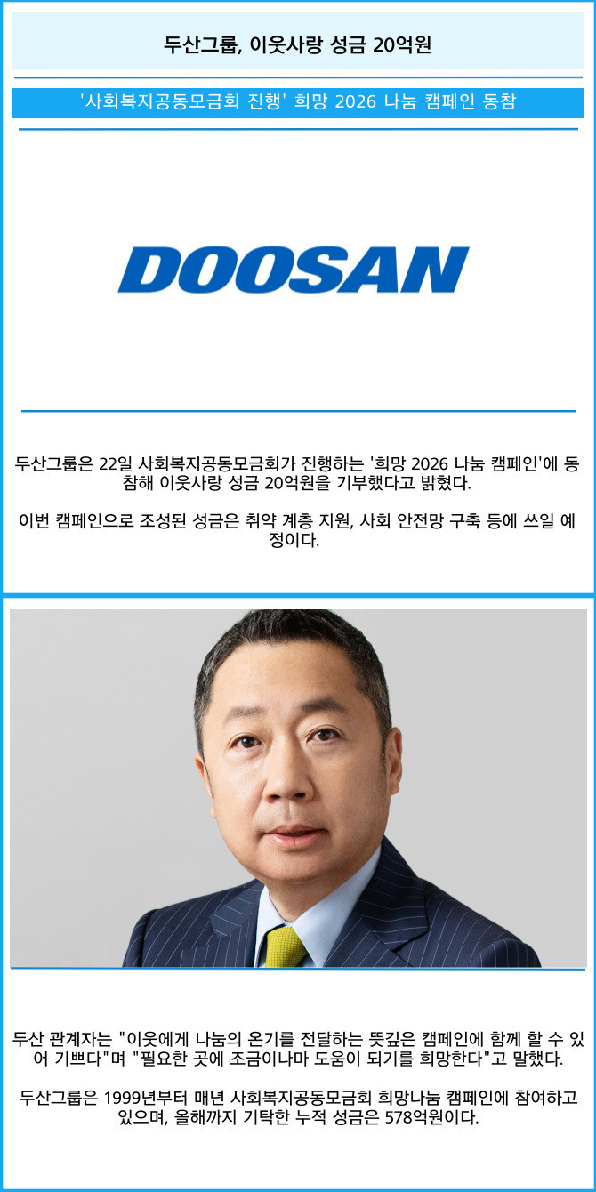 [프라임경제] 두산그룹은 22일 사회복지공동모금회가 진행하는 '희망 2026 나눔 캠페인'에 동참해 이웃사랑 성금 20억원을 기부했다고 밝혔다.
