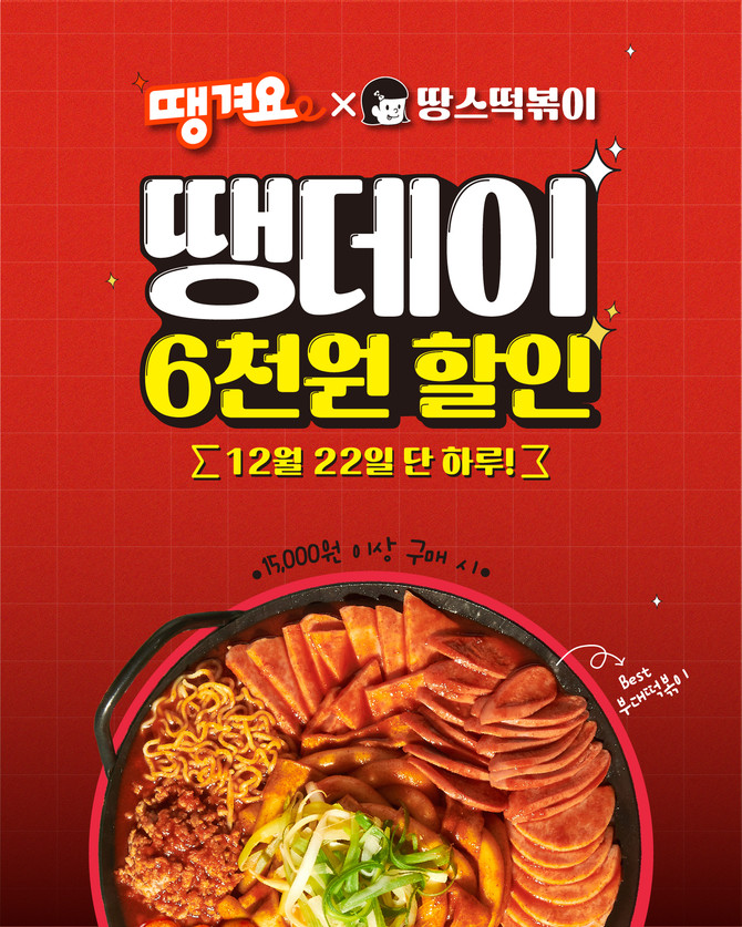 이번 프로모션은 12월22일 단 하루 진행된다. 땡겨요 앱에서 땅스즉석떡볶이 할인 쿠폰을 다운로드한 고객이 1만5000원 이상 배달 주문 시 6000원 할인 혜택을 받을 수 있다.