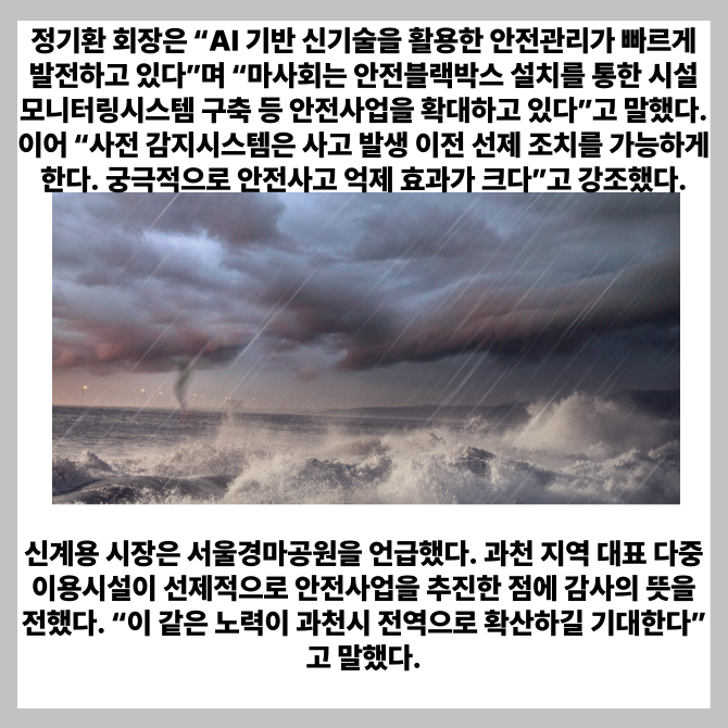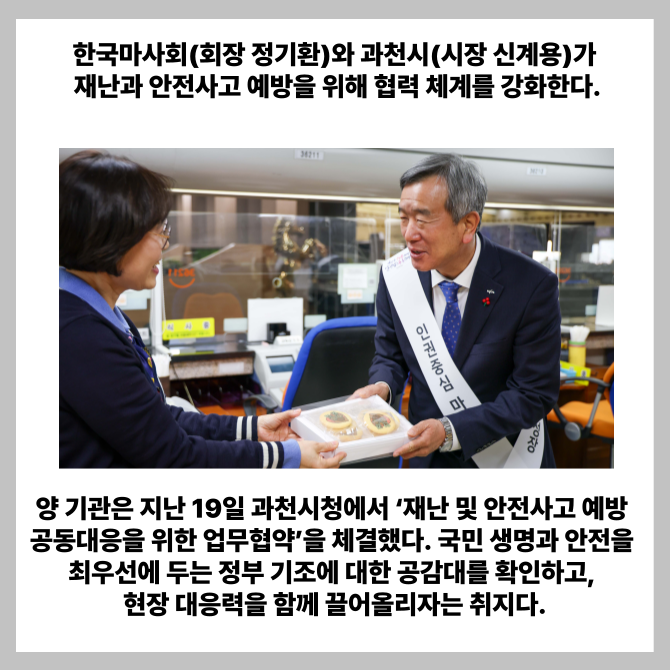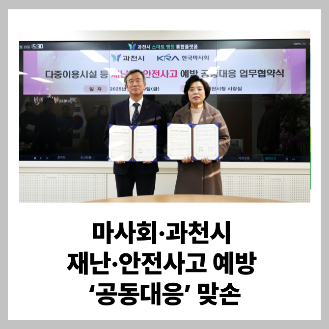 [프라임경제] 한국마사회(회장 정기환)와 과천시(시장 신계용)가 재난과 안전사고 예방을 위해 협력 체계를 강화한다고 22일 밝혔다.