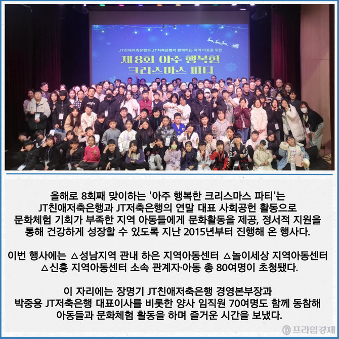 [프라임경제] JT친애저축은행과 JT저축은행이 성남시 바른아트센터에서 지역아동센터 관계자·아동을 초청해 '제8회 아주 행복한 크리스마스 파티' 행사를 진행했다고 22일 밝혔다.