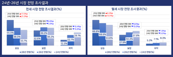이는 다방이 2023년부터 매년 진행해 온 임대차 시장 전망 조사 가운데 전세와 월세 모두에서 상승 전망이 가장 우세하게 나타난 첫 사례다. 지난해와 올해 조사에서는 전세는 보합, 월세는 상승 전망이 주를 이뤘으나, 내년을 바라보는 시각은 두 시장 모두 상승 쪽으로 기울었다.