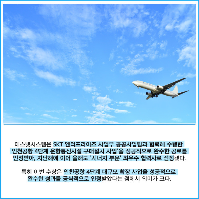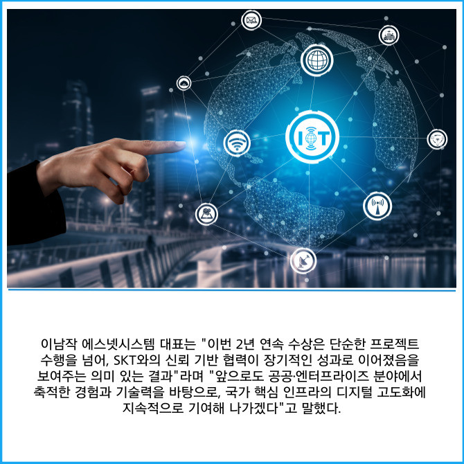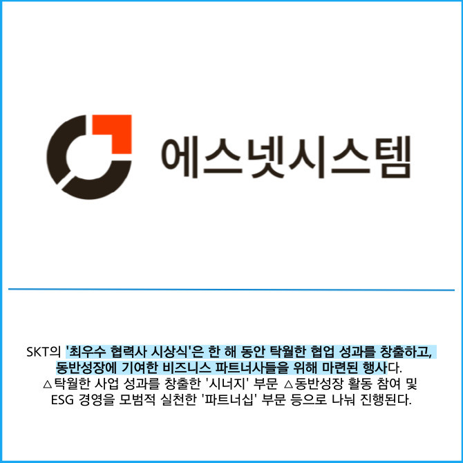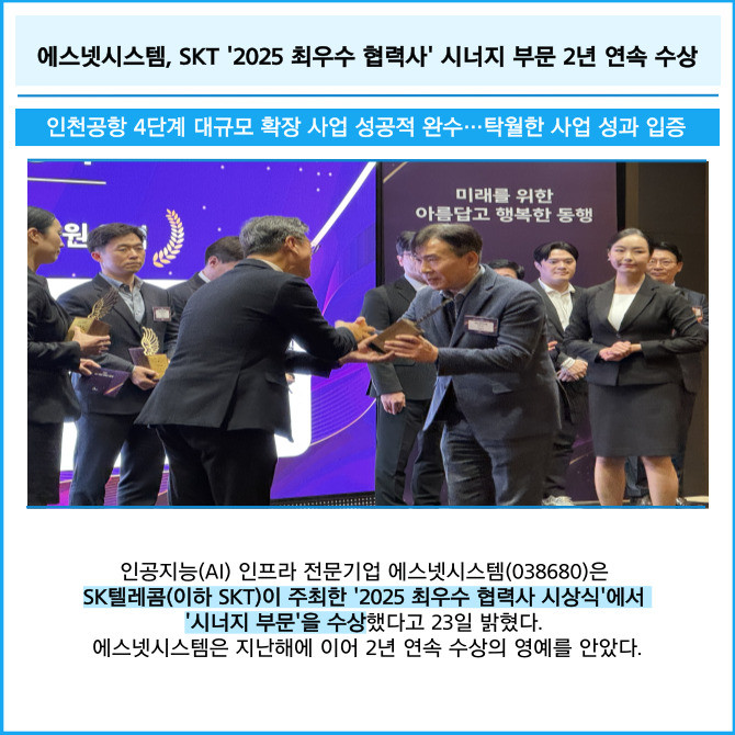 [프라임경제] 인공지능(AI) 인프라 전문기업 에스넷시스템(038680)은 SK텔레콤(이하 SKT)이 주최한 '2025 최우수 협력사 시상식'에서 '시너지 부문'을 수상했다고 23일 밝혔다. 에스넷시스템은 지난해에 이어 2년 연속 수상의 영예를 안았다.