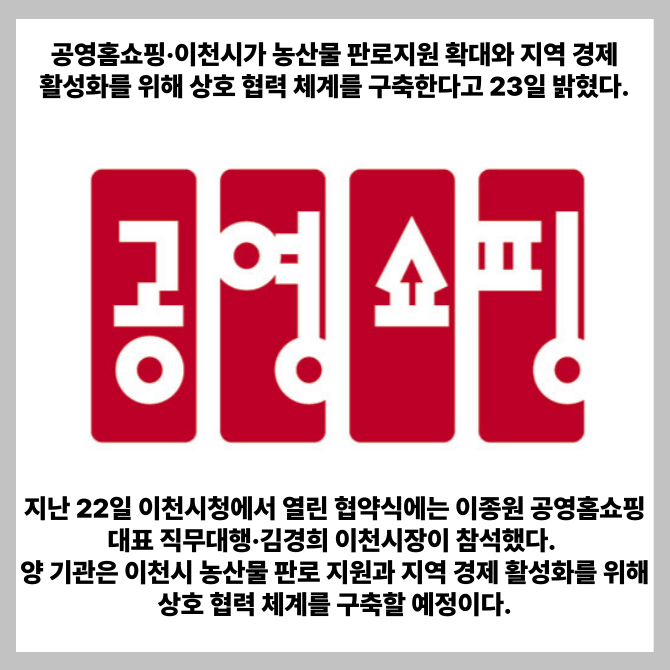 [프라임경제] 공영홈쇼핑·이천시가 농산물 판로지원 확대와 지역 경제 활성화를 위해 상호 협력 체계를 구축한다고 23일 밝혔다.