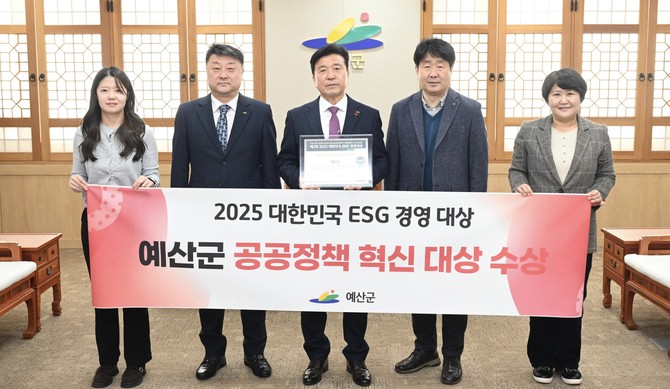[프라임경제] 충남 예산군이 국회의원회관 제1소회의실에서 열린 제2회 '2025 대한민국 ESG 혁신 어워즈(대한민국 ESG 경영대상)' 시상식에서 공공정책 혁신 부문 대상을 수상했다고 23일 밝혔다.