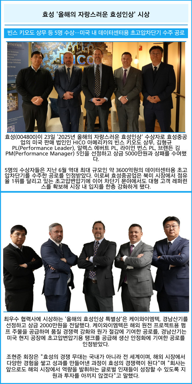 [프라임경제] 효성(004800)이 23일 '2025년 올해의 자랑스러운 효성인상' 수상자로 효성중공업의 미국 판매 법인인 HICO 아메리카의 빈스 키오도 상무, 김형규 PL(Performance Leader), 알렉스 에버트 PL, 라이언 번스 PL, 브랜든 김 PM(Performance Manager) 5인을 선정하고 상금 5000만원과 상패를 수여했다.