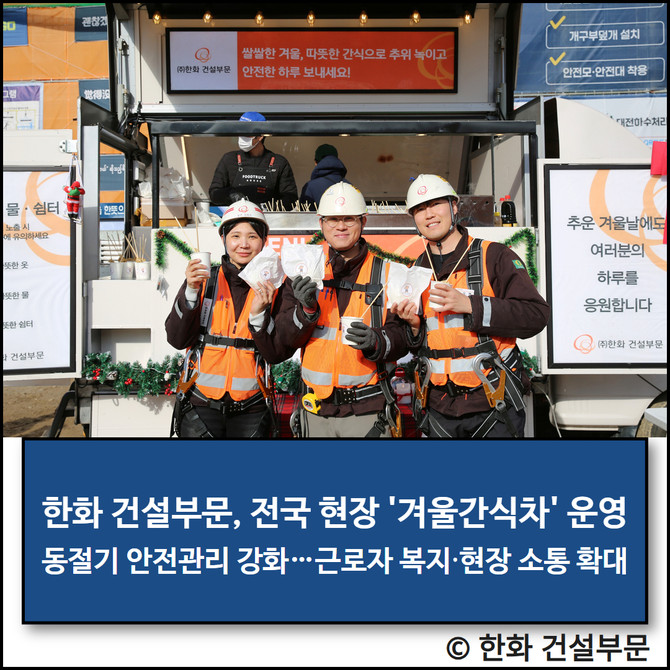 한화(000880) 건설부문이 겨울철 한파 속 근로자들을 격려하기 위해 '찾아가는 겨울 간식차' 프로그램을 운영한다고 23일 밝혔다.