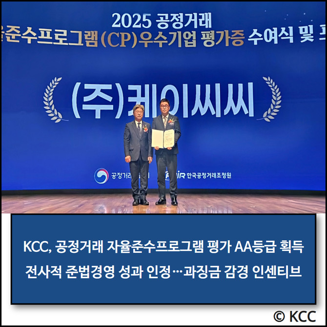 KCC(002380)는 공정거래위원회가 주최한 '2025 공정거래 자율 준수 프로그램(CP) 등급 평가'에서 AA 등급을 획득했다고 23일 밝혔다.
