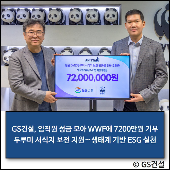 GS건설은 세계최대규모 비영리 국제 자연보전단체 (WWF)에 임직원들이 모은 성금을 후원하며, 지역사회 생태계 보전 지원을 통한 ESG 경영을 이어 나가고 있다고 23일 밝혔다.