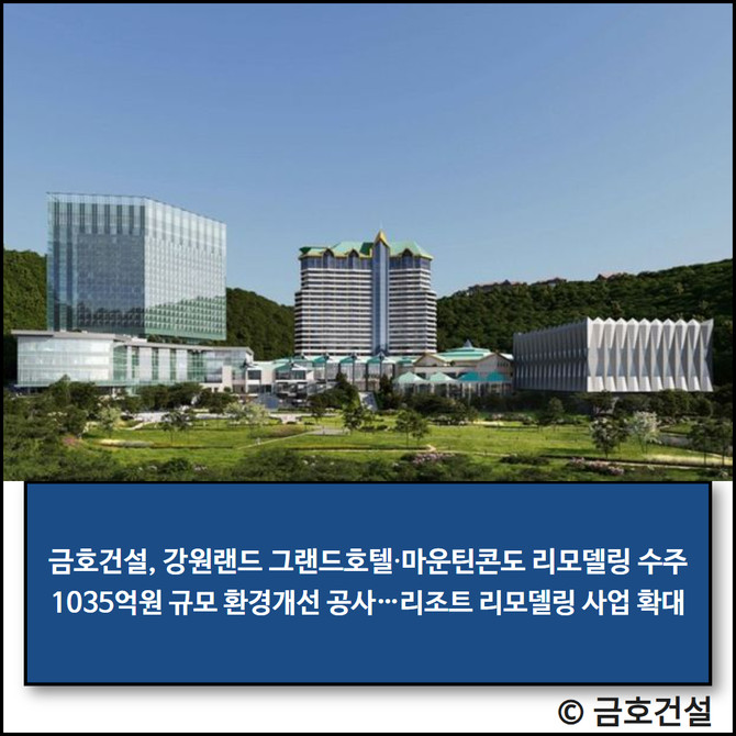 총 사업비는 1035억원 규모다. 금호건설은 지분 90%(931억원), 컨소시엄 주관사로 참여한다. 공사 기간은 착공일로부터 711일이다. 금호건설이 그랜드호텔·마운틴콘도를 성공적으로 개선할 경우 향후 대형 리조트 및 관광 시설 리모델링 사업으로 영역을 확대할 전망이다.