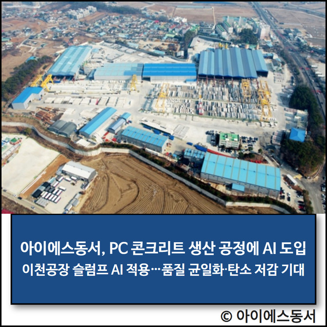 아이에스동서(010780)는 프리캐스트 콘크리트(이하 PC) 제품을 생산하는 이천공장(경기 이천시 부발읍 일원)의 콘크리트 배합과 생산 공정에 인공지능(AI) 기술을 도입한다고 23일 밝혔다.