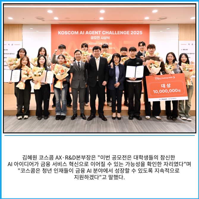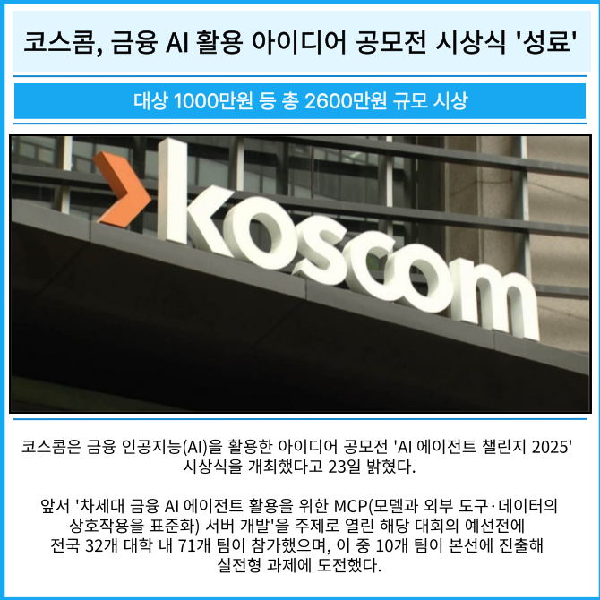[프라임경제] 코스콤은 금융 인공지능(AI)을 활용한 아이디어 공모전 'AI 에이전트 챌린지 2025' 시상식을 개최했다고 23일 밝혔다.