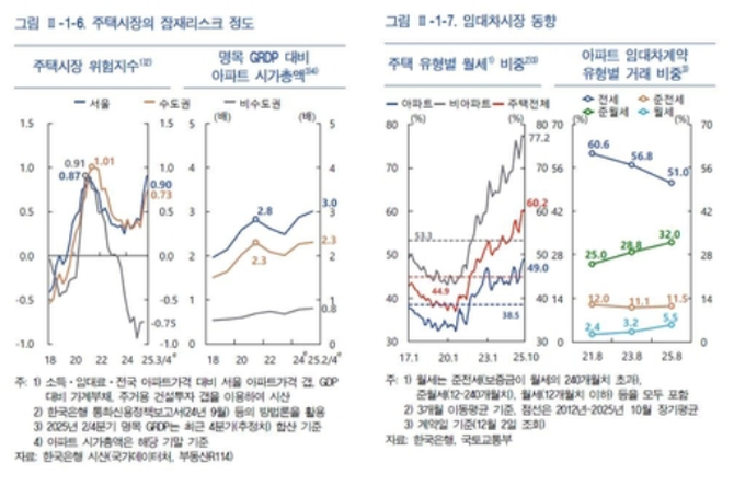 이어 "비수도권 주택시장의 부진은 지역 금융기관의 재무 건전성을 악화시킬 수 있으며, 수도권 주택 가격 상승세의 지속은 금융 불균형을 확대하는 등 잠재적인 위험을 초래할 수 있다"고 덧붙였다.