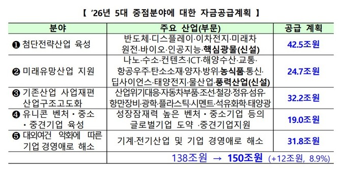 이 중 첨단전략산업 육성, 미래 유망산업 지원, 기존 산업의 사업재편, 벤처·중소·중견기업 육성, 기업 경영애로 해소 등 5대 중점분야에는 150조원 이상이 배정된다. 5대 분야 공급 규모는 올해 목표치인 138조원 대비 8.9% 늘어난 150조원이다.