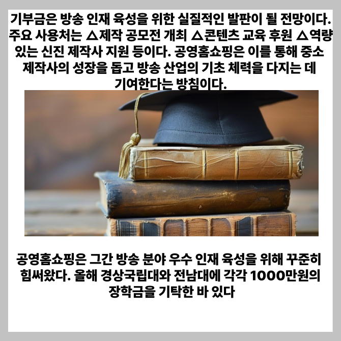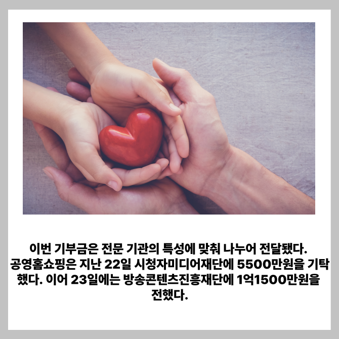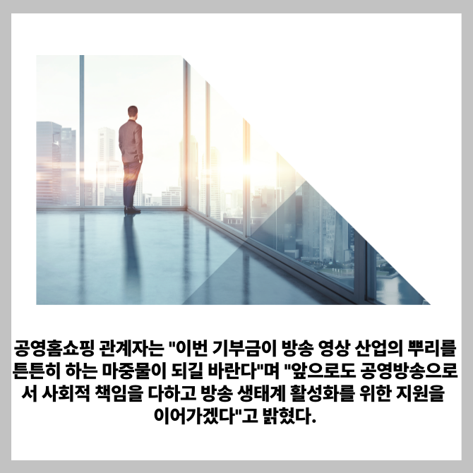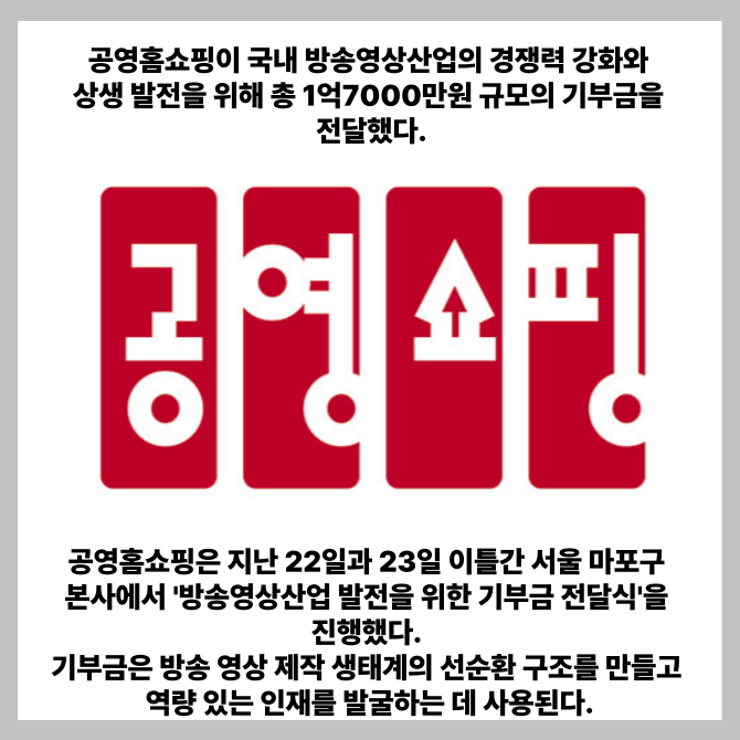 공영홈쇼핑은 지난 22일과 23일 이틀간 서울 마포구 본사에서 '방송영상산업 발전을 위한 기부금 전달식'을 진행했다고 24일 밝혔다.