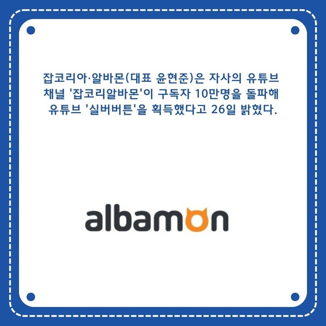 [프라임경제] 잡코리아·알바몬(대표 윤현준)은 자사의 유튜브 채널 '잡코리알바몬'이 구독자 10만명을 돌파해 유튜브 '실버버튼'을 획득했다고 26일 밝혔다.