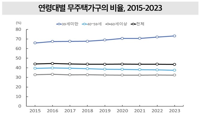 특히 청년층에서는 무주택 비율이 뚜렷한 상승세를 보였다. 39세 이하 청년층의 무주택 가구 비율은 2023년 73.2%로, 2015년(65.9%) 대비 큰 폭으로 높아졌다.