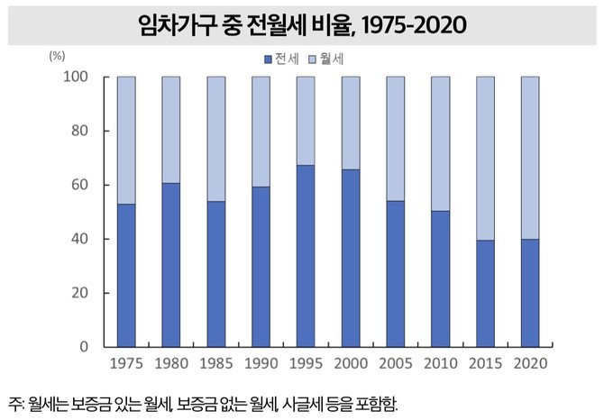 임차 구조의 변화에서 가장 눈에 띄는 대목은 월세 비중이다. 임차가구 중 월세 비중은 1995년 32.8%에서 꾸준히 증가해 2020년에는 60.1%에 달했다.