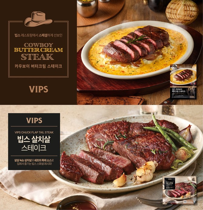 '카우보이 버터크림 스테이크'는 매장 인기 메뉴를 구현한 제품이다. 두툼한 미국산 살치살에 SNS에서 화제인 '카우보이 버터크림' 소스를 더했다. 버터와 마늘, 양파, 휘핑 크림을 조합한 빕스 특제 소스가 깊은 풍미를 낸다.
